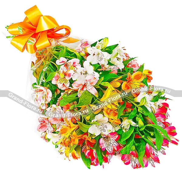Роскошная охапка альстромерий с вкраплениями зелени придется по душе активным, жизнелюбивым, целеустремленным девушкам. Букет идеален в качестве презента за какие-то жизненные заслуги – окончание учебного года, защита диплома, повышение по карьерной лестнице, рождение ребенка. Альстромерия считается жизнестойким цветком, она имеет свойство распускать бутоны даже в срезанном состоянии.