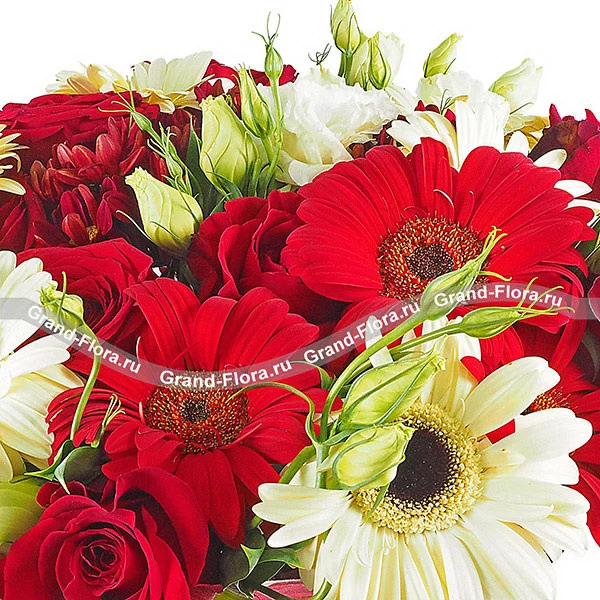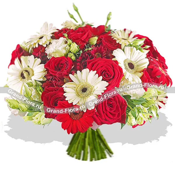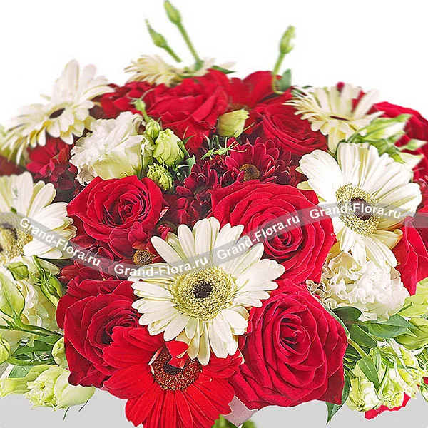 Стандартный (на фото): роза красная - 11 шт, гербера белая - 6 шт, хризантема кустовая красная - 5 шт, эустома белая - 5 шт,  сетка красная.