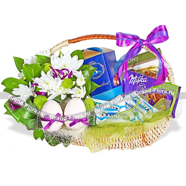Уменьшенный: хризантема кустовая белая - 1 шт, хризантема куствая зеленая - 1 шт, рускус, оазис,  декоративное яйцо - 1 шт, конфеты "Вдохновение" - 150 гр, конфеты  "Комильфо" - 118 гр, шоколадные батончики "bounti mini" - 4 шт, декор, бант фиолетовый, корзина малая.